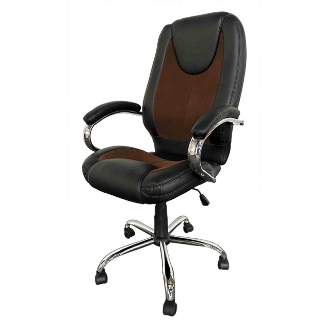 Мениджърския офис стол 144 е удобен модел офис стол тапициран с качествена еко-кожа в комбинация с кафяв плюш и висока облегалка. Кръстачката в основата на офис стол 144 и подлакътниците са метални с хром-никелово покритие. Офис стола е с механизъм с релакс и с газов амортисьор за корекция на височината при ползване.