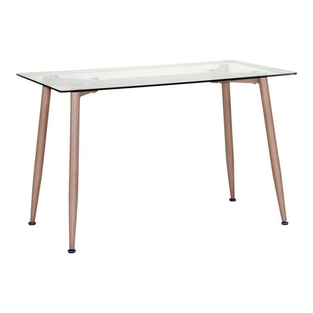 Маса АМ-С-290-1-2 е трапезна маса с плот от закалено стъкло с дебелина 8мм. и размер 120/70 см. Краката са метални с прахово покритие имитиращо дърво.
