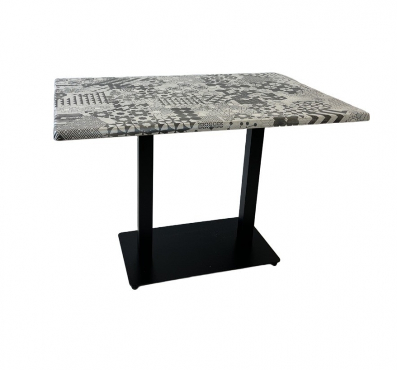 Маса Е93 е с метална основа с черно прахово покритие. Подходяща е за вътрешно и външно обзавеждане. Основата е с размер 70/40 см. Плота на масата е верзалит с размер 120/80см. Височина на масата -75h. Верзалитовите плотове се изработват по специална технология и термична обработка на дървени частици, смоли и меламин. Това е уникален продукт, които издържа на различни атмосферни условия- влага, слънце, температура до 180 градуса и повърхностно износване.