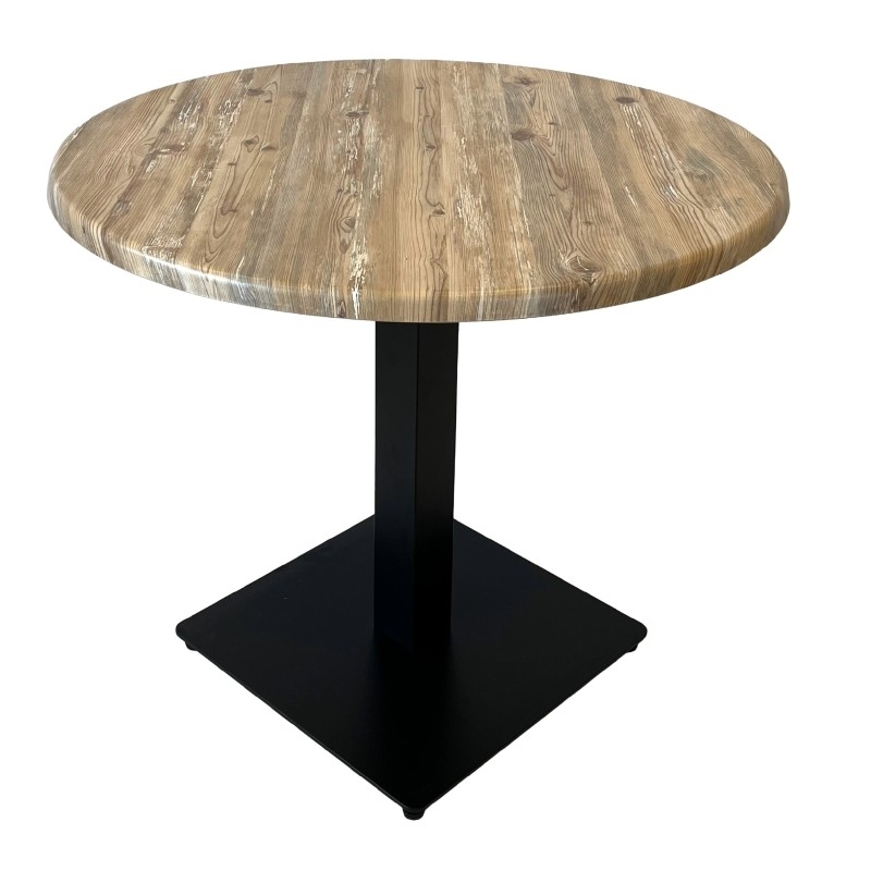 Маса Е44-4 е със стоманена основа с черно прахово покритие. Подходяща е за вътрешно и външно обзавеждане. Основата е с размер 50/50 см. с включени крачета за нивелиране. Плота на масата е верзалит с размер ф90см. Височина на масата -75h. Верзалитовите плотове се изработват по специална технология и термична обработка на дървени частици, смоли и меламин. Това е уникален продукт, които издържа на различни атмосферни условия- влага, слънце, температура до 180 градуса и повърхностно износване.